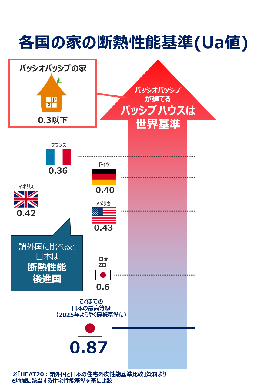 パッシオパッシブでは一般的な基準よりも高い、世界基準のパッシブハウスをベースとした断熱・気密性能の設計を行っています。これは、日本の一般的な住宅基準と比べても非常に高い水準です。